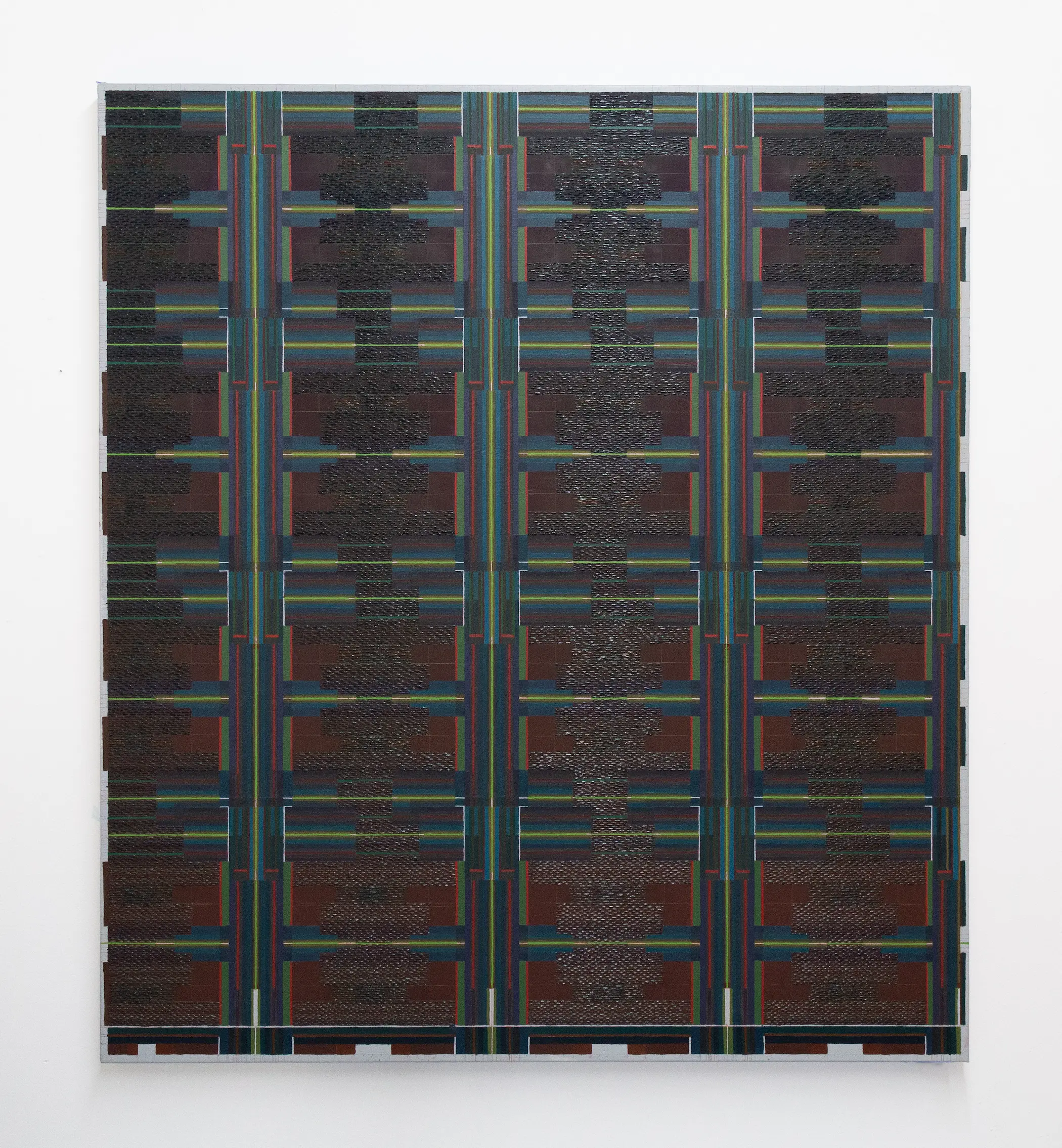 If Hernandez works primarily in the pearlescent, pastel palette of a sunrise, Luis Emilio Romero’s adjacent oil paintings capture the umbers and indigoes of dusk. The New Jersey-raised painter’s early work modeled its structures from Indigenous Guatemalan textiles, but now their mazelike gridded surfaces have taken on a life of their own. Standing at a distance from the paintings still might fool a viewer into seeing plaid fabric, but looking for longer, the tesselate designs may invoke more mysterious architectural structures, what Romero himself refers to as “fortresses,” or even the intricate byways of a circuitboard. What remains important across Romero’s practice are principles of luminosity and tactility, achieved by thicker, stitch-like brushstrokes of oil paint that catch light and create a subtle gradient sheen across partitioned segments of the paintings. Hand-drawn lines and carefully-chosen palettes charge the work with interconnected systems of light and dark.