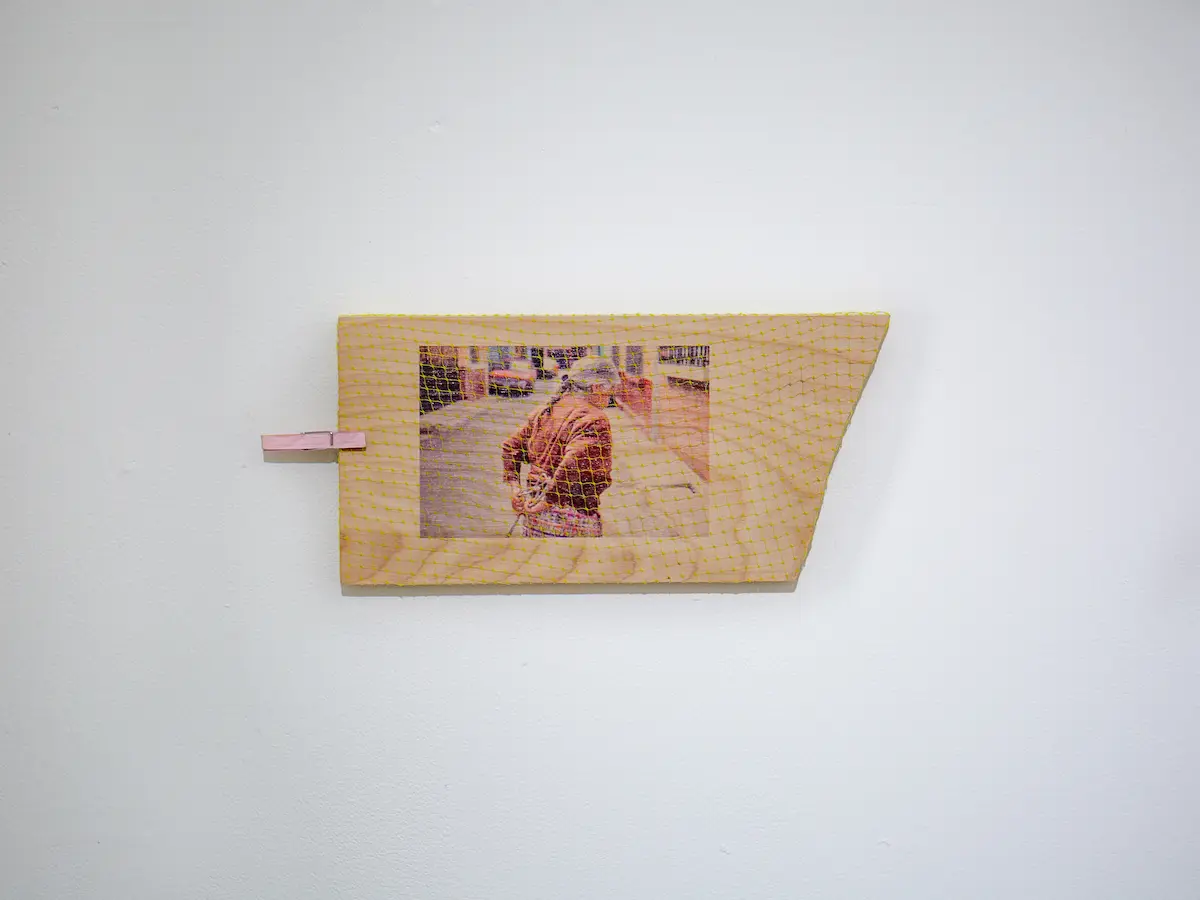 Nivia Hernandez, She whistles before the birds wake up to sing/Ella silba antes de que los pájaros se levanten para cantar, 2025. Produce bag netting, uv print on wood, wooden clip, house paint, 5 in x 11 1⁄2 in. Courtesy of Gallery Bergen.